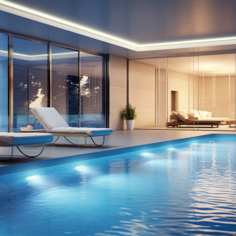 Gradual changes in lighting intensity or colour along the pool perimeter or underwater can give a subtle and sophisticated gradient effect. This design choice adds depth and dimension to the pool area. It creates a visually interesting and calming environment, especially during sunsets. Â