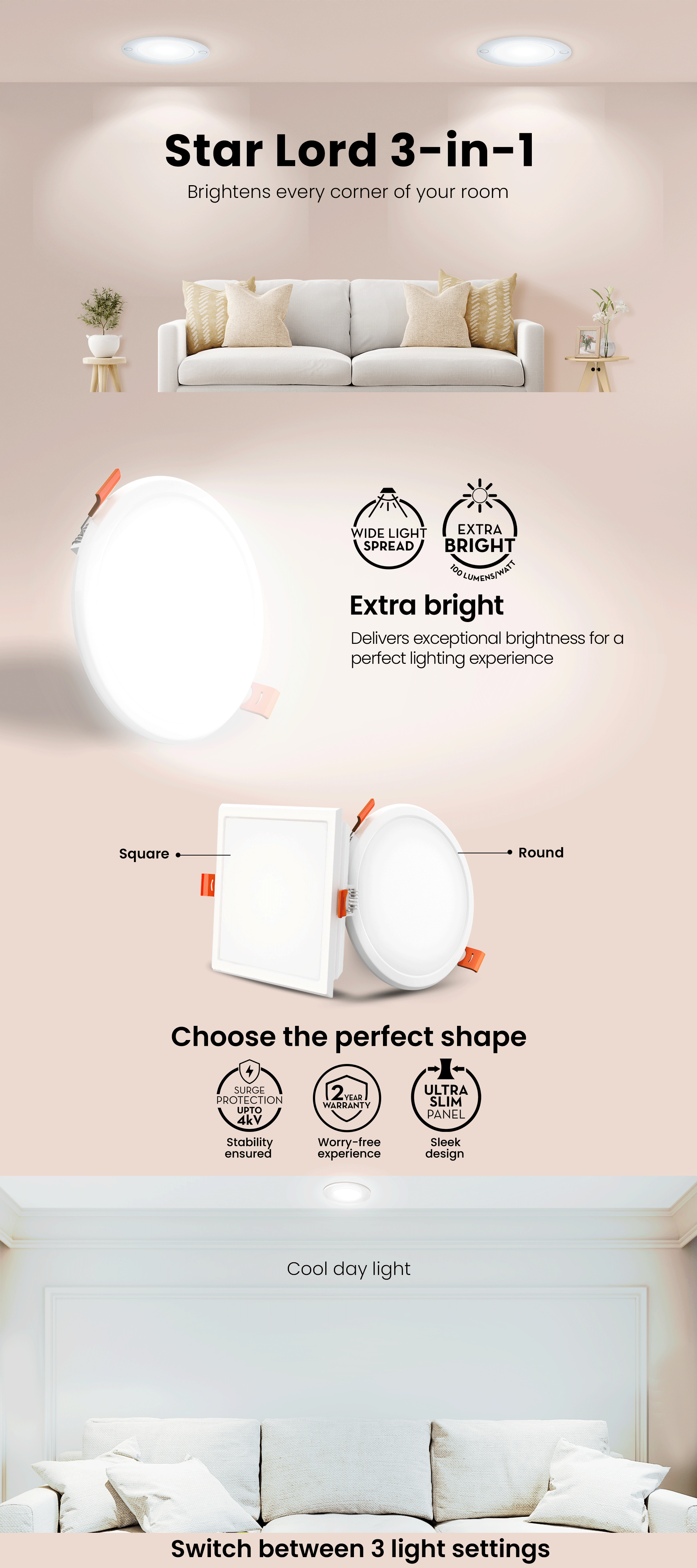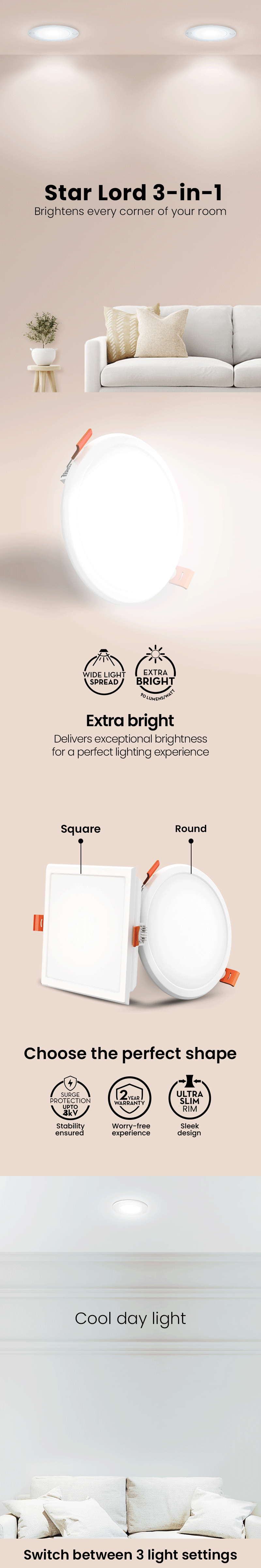 Introducing the Star Lord 3-in-1 Ceiling Light - an illuminating masterpiece. With its extra bright radiance, it transforms any space into a captivating haven. Equipped with surge protection, it ensures your peace of mind. Backed by a generous 2-year warranty, its robust features promise lasting brilliance. Experience versatile lighting options with its unique 3-in-1 design, making Star Lord the ultimate choice for both style and functionality in your space.
