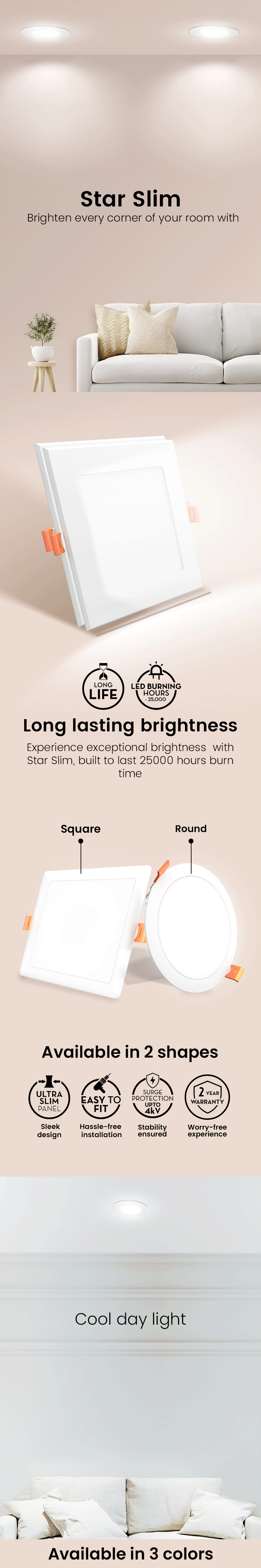 Illuminate your world with extra brightness with Star Slim. Equipped with surge protection, it's built to withstand electrical fluctuations. Enjoy peace of mind with a generous 2-year warranty. The Star Lord's super-slim panel design seamlessly blends with any decor, adding a touch of sophistication to your ambiance while lighting up your life.