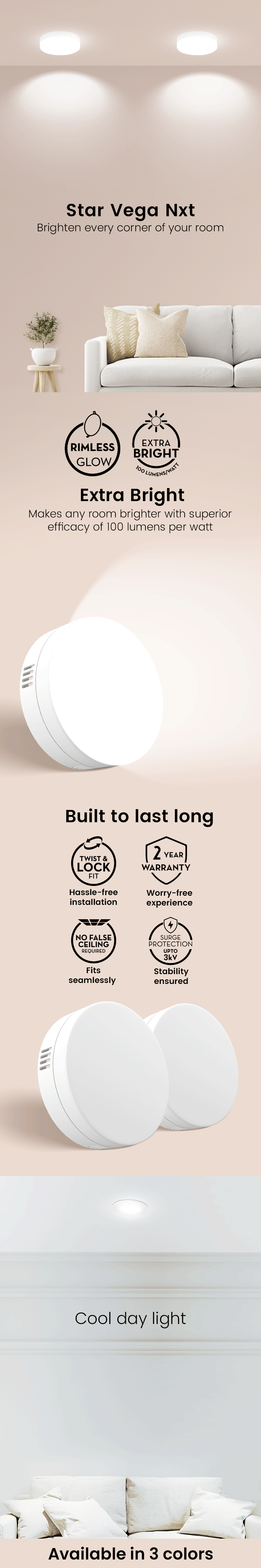 Experience extraordinary brightness with Star Vega Nxt that lights up every corner. With built-in surge protection, your investment is safeguarded. Enjoy peace of mind with a generous 2-year warranty. Easy installation ensures a hassle-free setup.