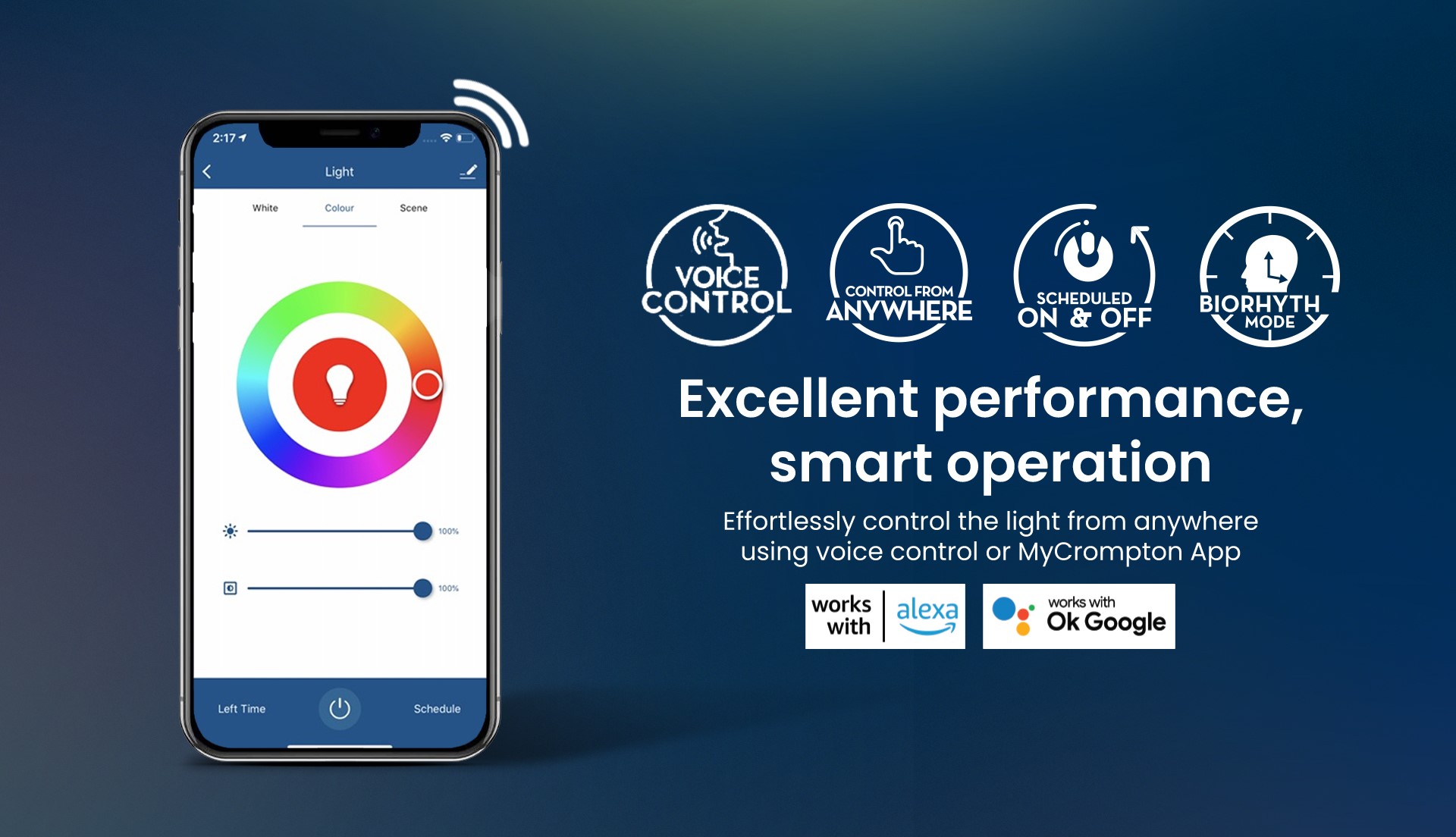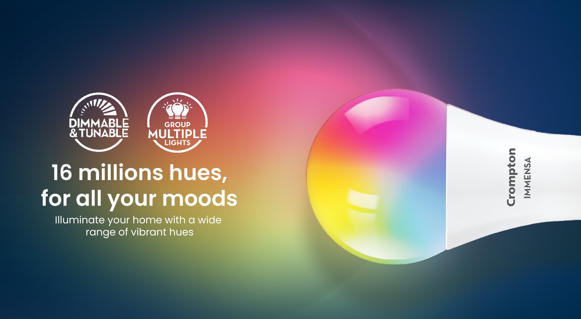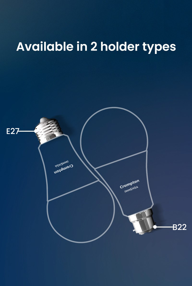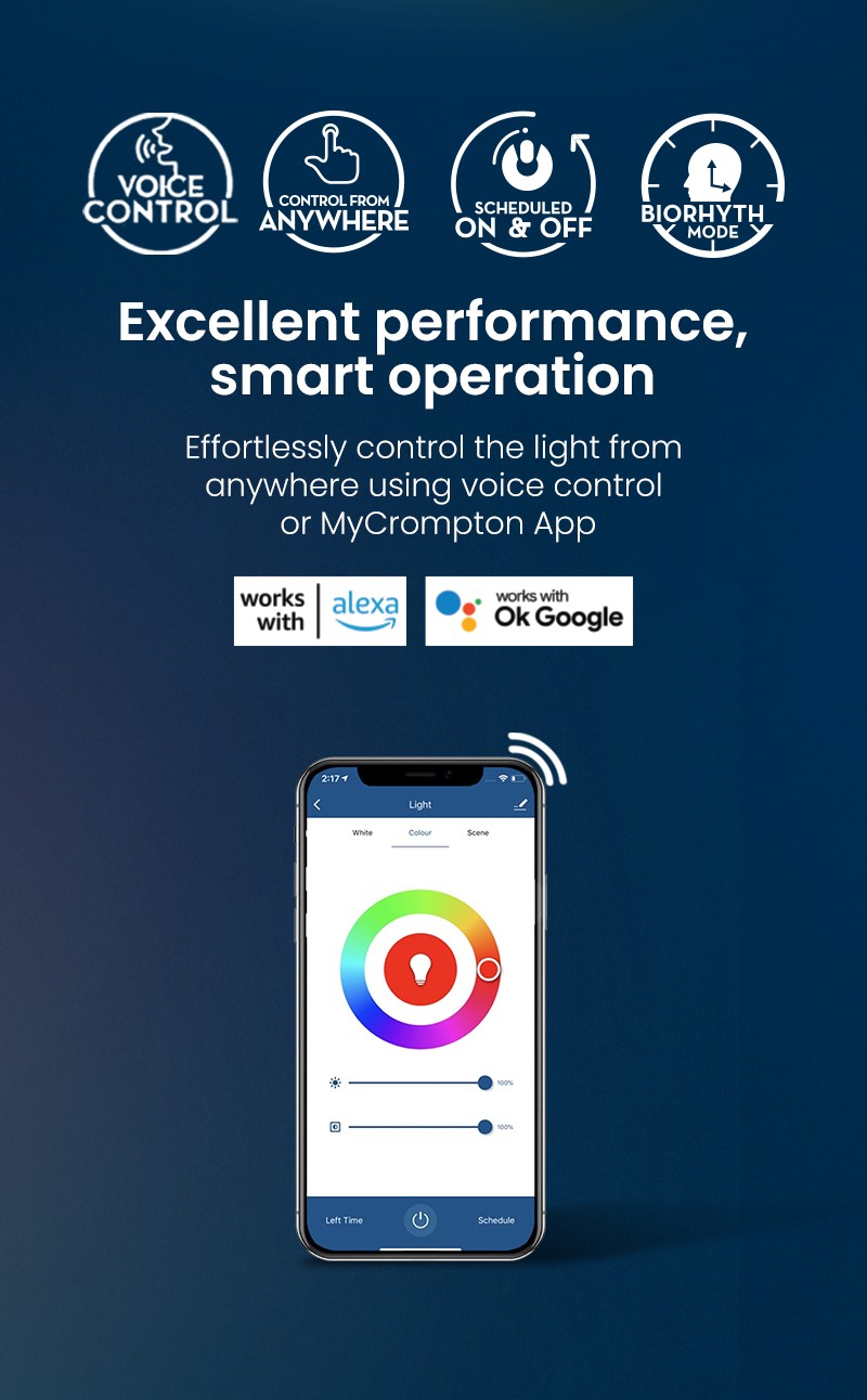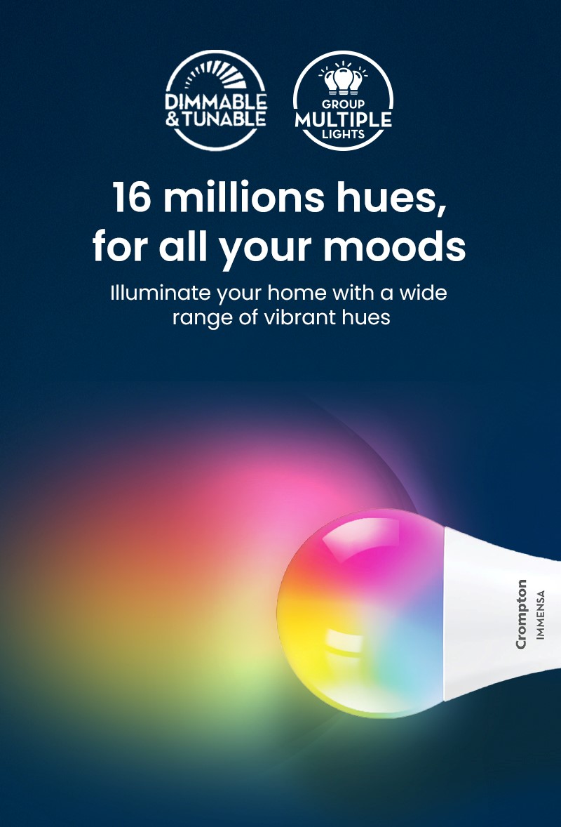 Illuminate your space with app-enabled wifi smart bulbs to effortlessly create the perfect ambiance for any occasion with a palette of 16 million colors at your command, and adjust the brightness according to your mood to customise your lighting experience. Pair multiple bulbs simultaneously for synchronised lighting effects. Enjoy convenient control of all the advanced features through voice control using Google Assistant, Amazon Alexa, or the My Crompton mobile app.