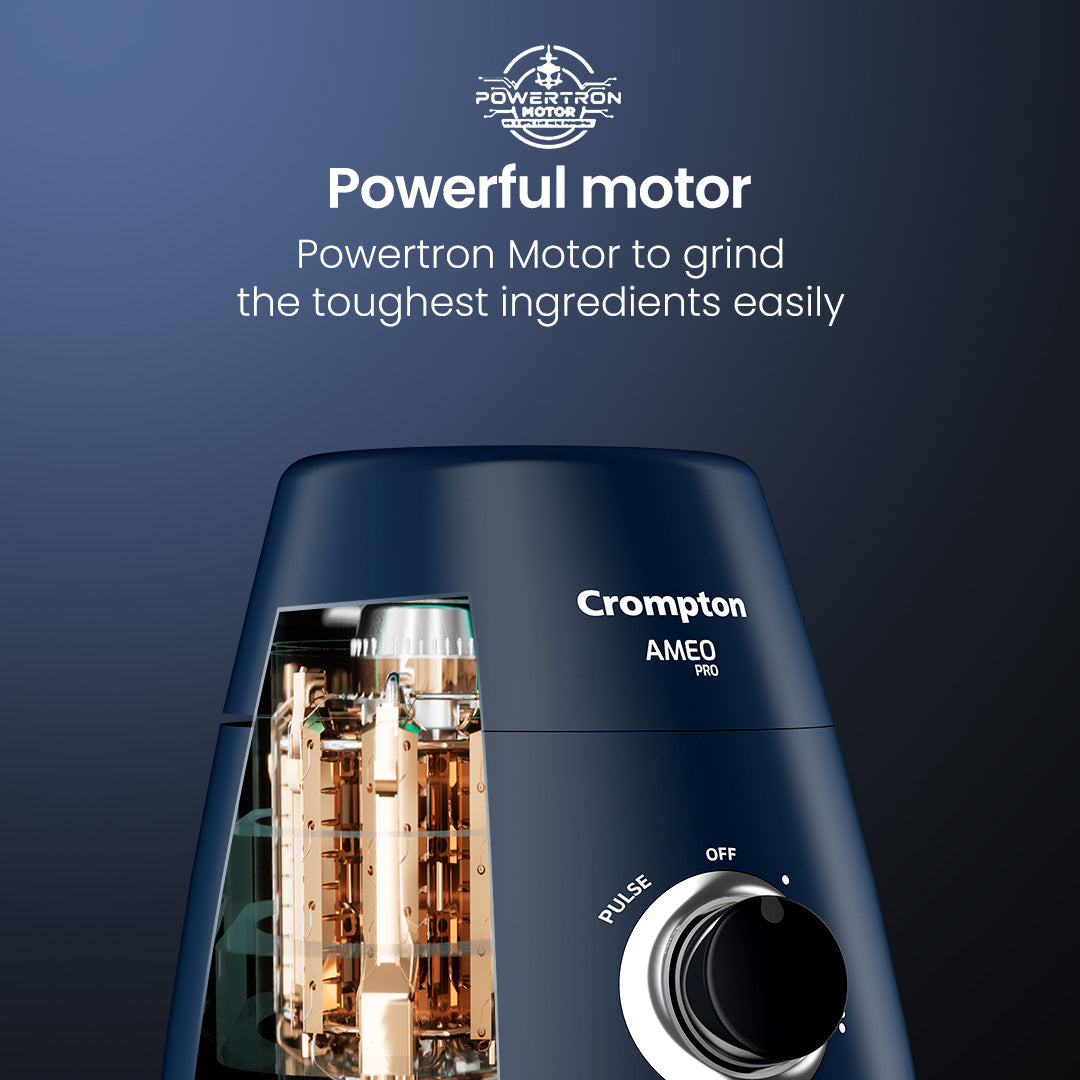 Meet the Crompton Ameo Pro Mixer Grinder — a culinary powerhouse engineered with cutting-edge features for unparalleled performance. With Maxigrind Technology at its core, this grinder delivers precision grinding, ensuring consistent results with every use. Adding a touch of sophistication, the grinder comes with a the chrome-plated knob, designed for intuitive and user-friendly operation. Engineered with Motor Vent X technology, it efficiently dissipates heat, extending the motor's life for enduring durability and reliability. Elevate your culinary creations with the Ameo Pro, where innovation seamlessly merges with convenience to redefine your kitchen experience.