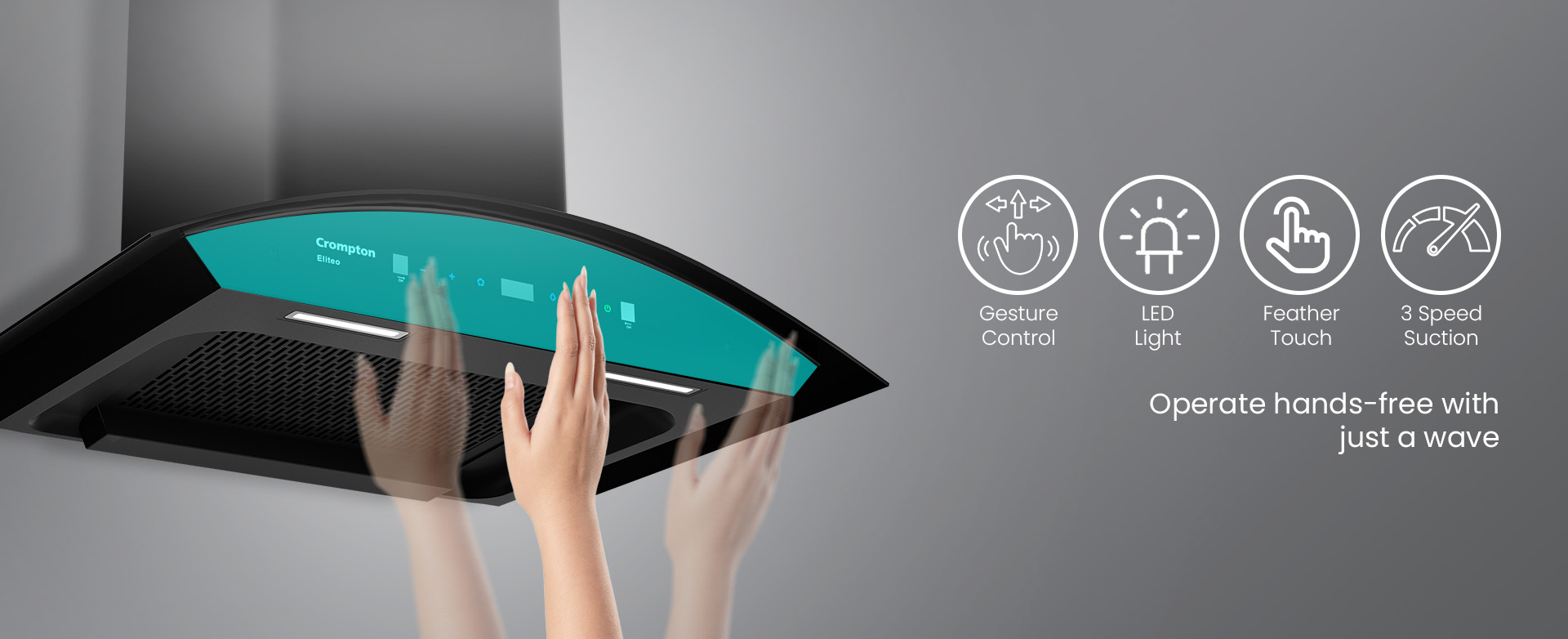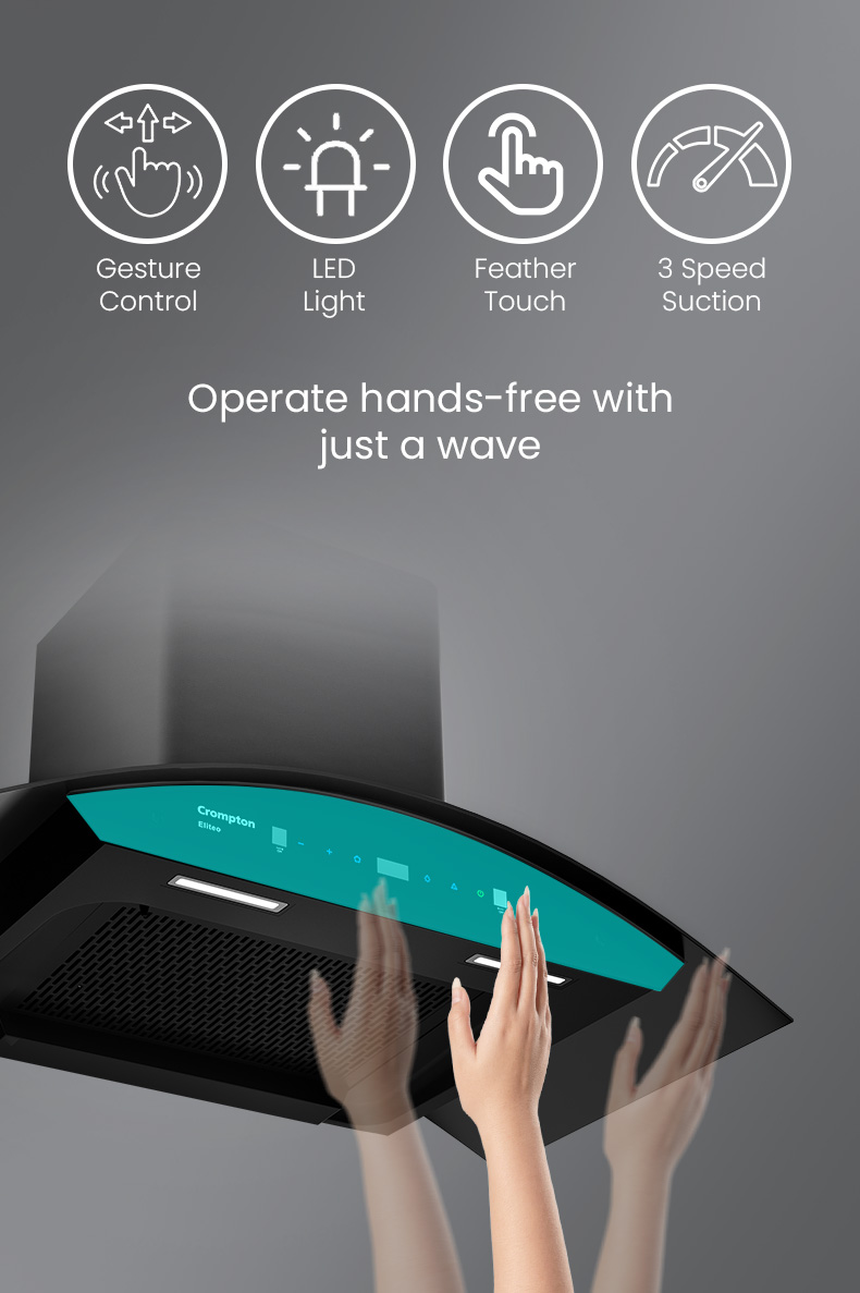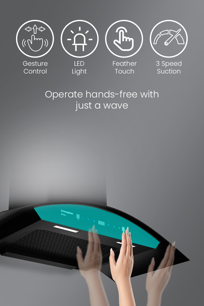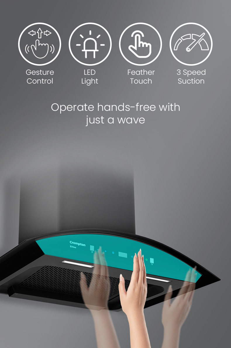 Upgrade your kitchen with the Crompton Eliteo Chimney, built for effortless performance and modern convenience. Its Intelligent AutoClean function saves you the hassle of frequent cleaning, while Smart On and Gesture Control make operation completely hands-free and intuitive. It is powered by an advanced BLDC motor, which delivers high performance with greater energy efficiency and durability. Its broad surface area ensures maximum smoke capture in one go, giving you a cleaner, healthier cooking environment every time. With the Eliteo chimney, you don’t just cook, but you cook smart, safe, and stress-free.