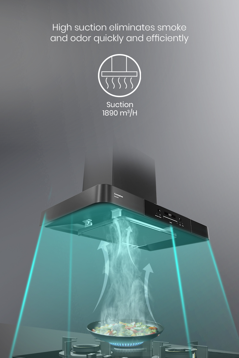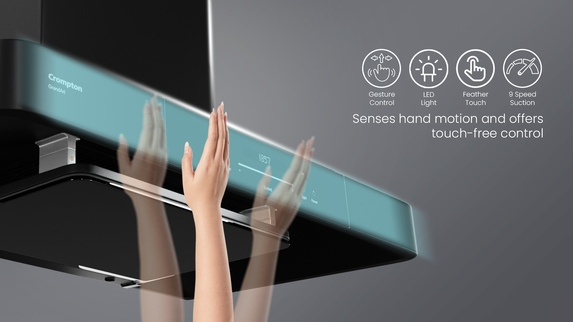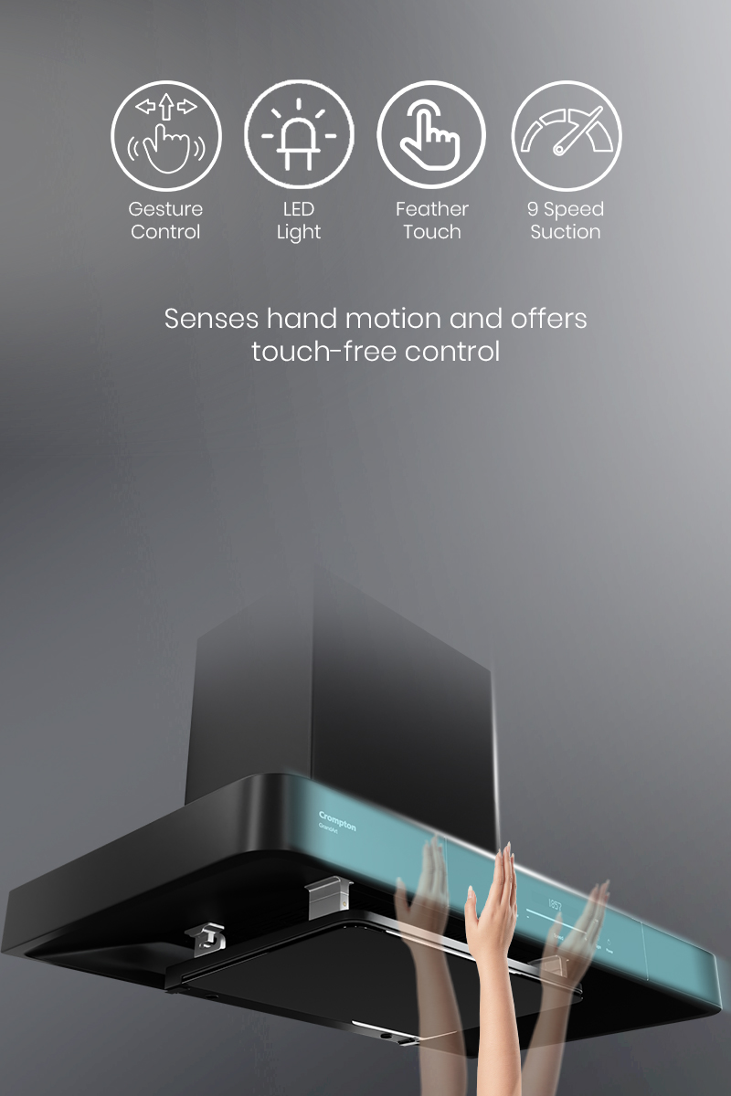 Elevate your kitchen with the Crompton GrandArt Box Chimney, designed to seamlessly integrate with modern kitchen setups. Its elegant box-shaped design enhances the look of contemporary spaces while offering powerful suction to remove smoke and odors efficiently. The Intelligent AutoClean feature automatically eliminates oil and grime after 30 hours of use, ensuring low maintenance. With Smart Gesture Control, you can operate the chimney hands-free for added convenience. Quiet and efficient, the GrandArt keeps your kitchen air fresh and your space spotless, making cooking a delightful experience.