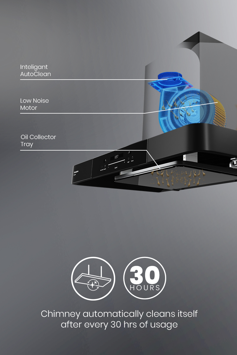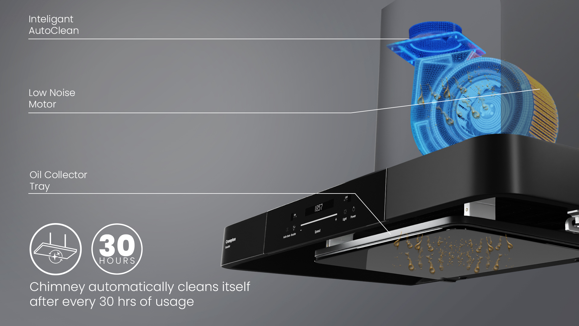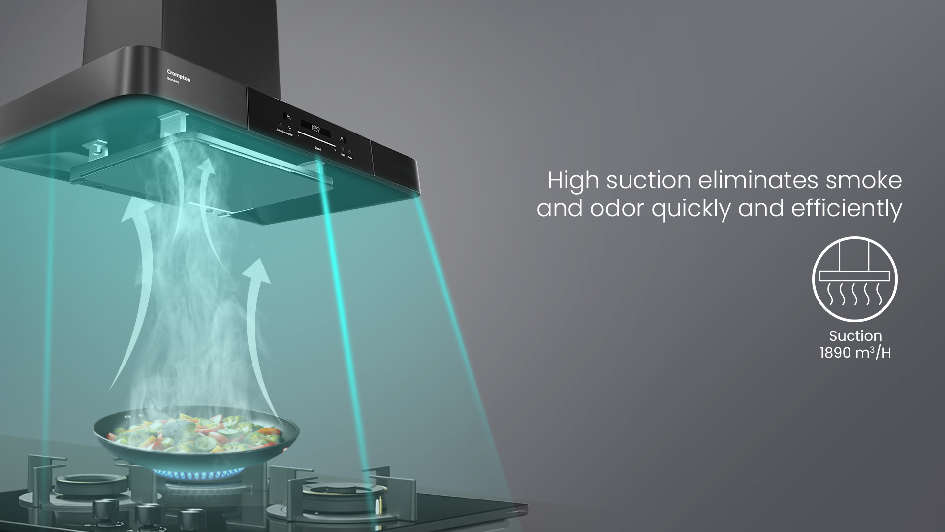 Elevate your kitchen with the Crompton GrandArt Box Chimney, designed to seamlessly integrate with modern kitchen setups. Its elegant box-shaped design enhances the look of contemporary spaces while offering powerful suction to remove smoke and odors efficiently. The Intelligent AutoClean feature automatically eliminates oil and grime after 30 hours of use, ensuring low maintenance. With Smart Gesture Control, you can operate the chimney hands-free for added convenience. Quiet and efficient, the GrandArt keeps your kitchen air fresh and your space spotless, making cooking a delightful experience.
