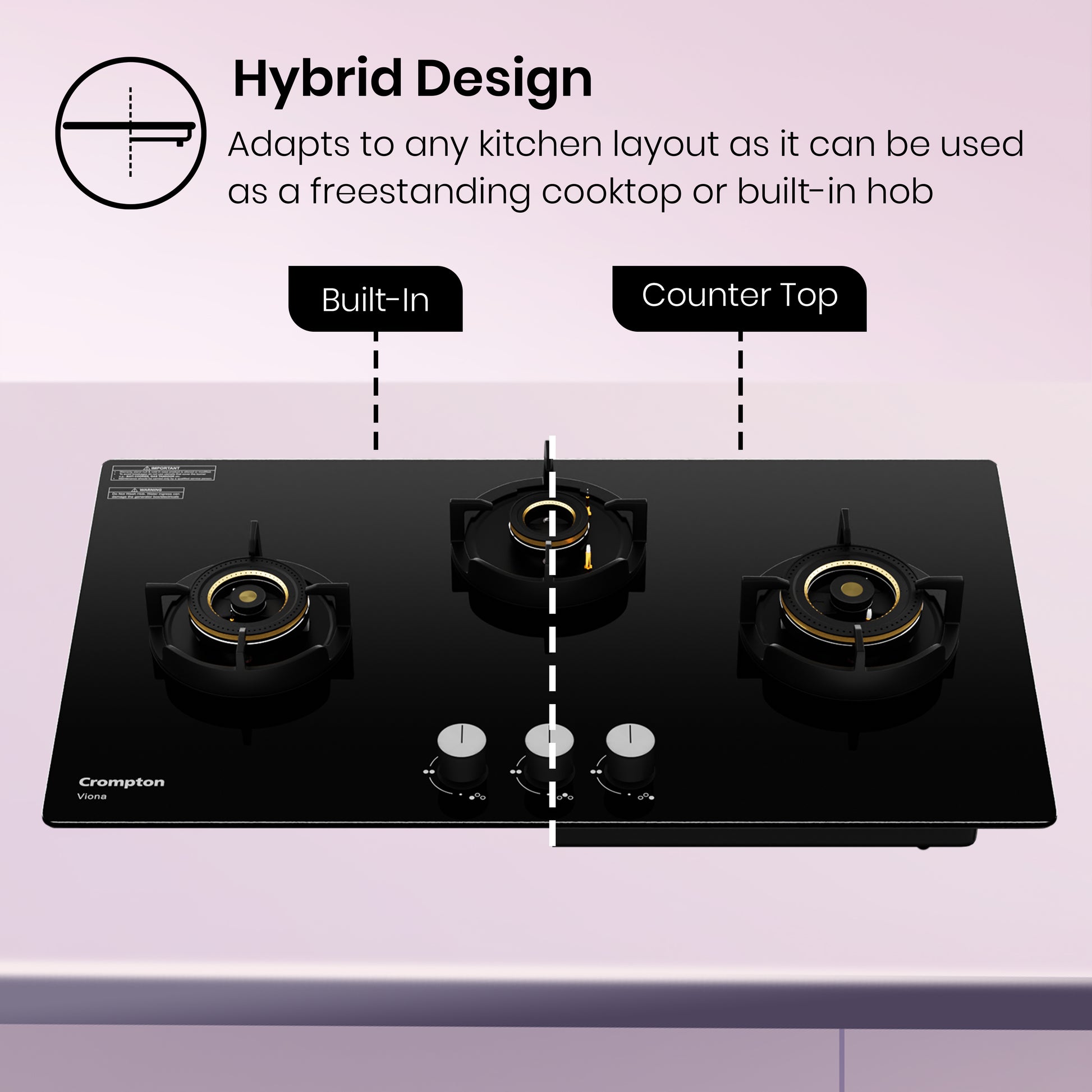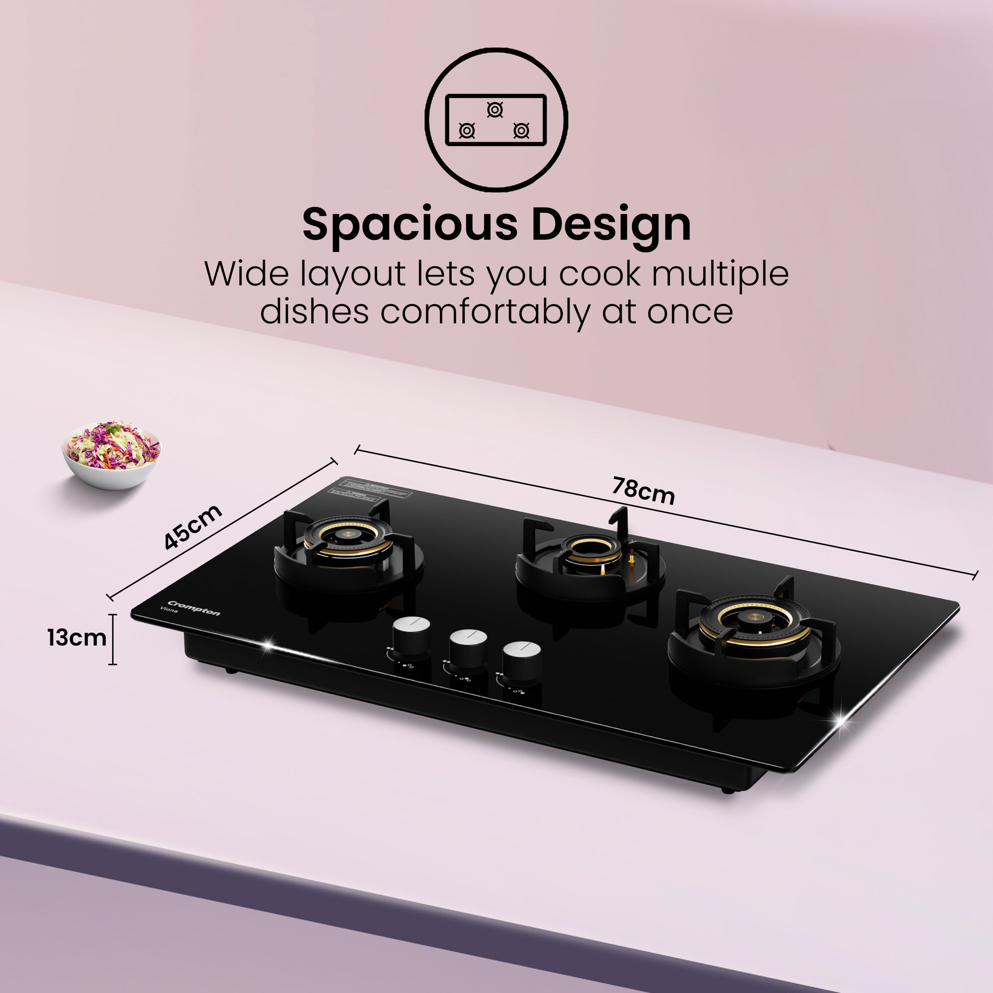Bring home the Crompton Viona hob, built to make cooking faster, safer, and more effortless. With its direct flame burner and high-efficiency design, you enjoy quicker cooking with even heat distribution—saving both time and fuel. The flame failure device adds peace of mind by automatically cutting off gas if the flame goes out, while the sealed burner system and enamel-coated pan ensure your kitchen remains clean and durable. The convenience of auto ignition and the ease of ergonomic knob controls make every meal a seamless experience. The Viona hob is about experiencing safety, style, and performance in every dish.