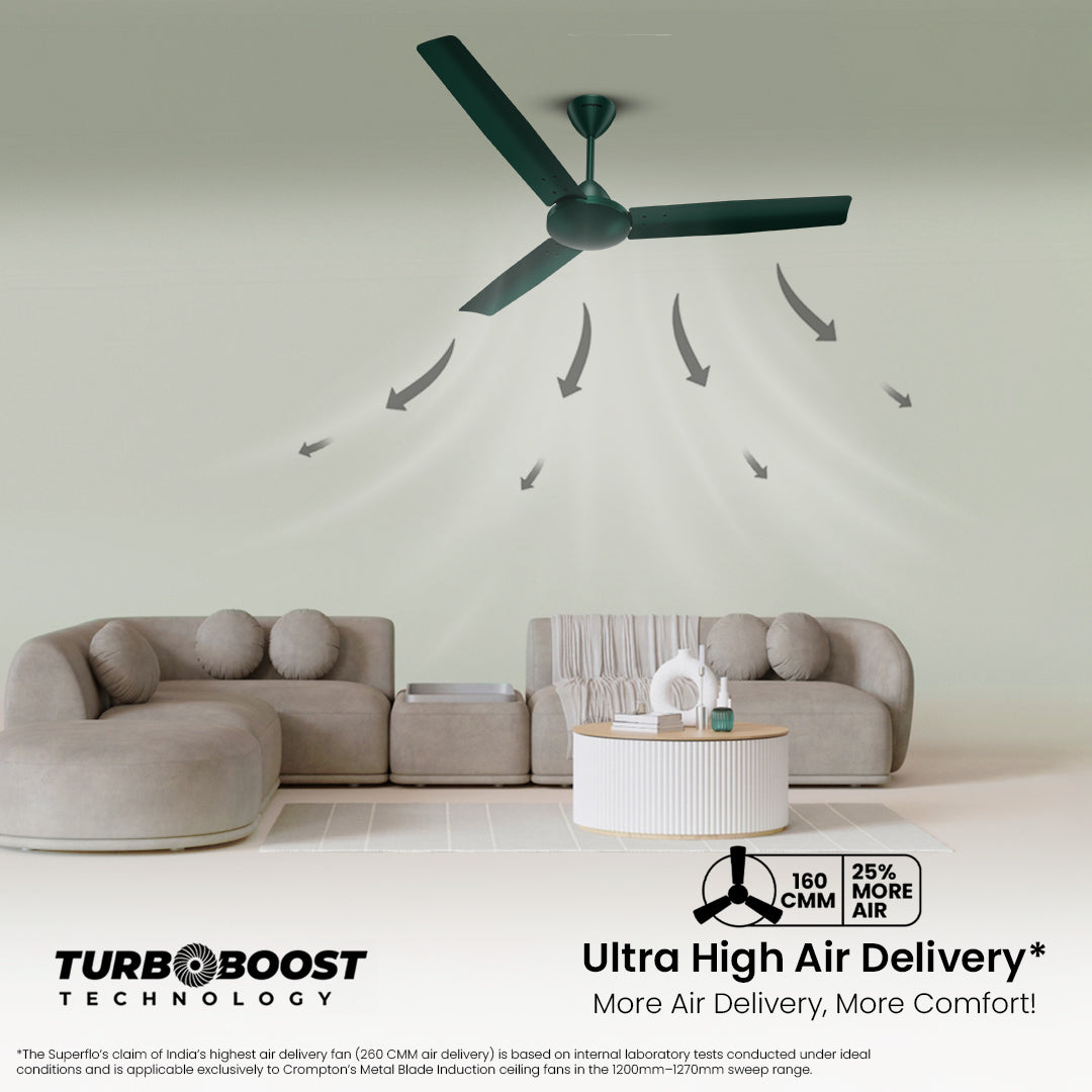 Experience the comfort of refreshing air with the Crompton HS Superflo fan. Powered by TurboBoost Technology, it provides an ultra-powerful 160 CMM air delivery and a high speed of 400 RPM for maximum comfort. Designed for durability, its anti-corrosive aluminum body ensures long-lasting performance, even in tough conditions. With just 44W power input, you can enjoy energy-efficient cooling whenever you need it. Whether it’s for your home or workspace, HS Superflo provides consistent airflow and reliable performance. Built for power, comfort, and durability, HS Superflo keeps you refreshed, always!