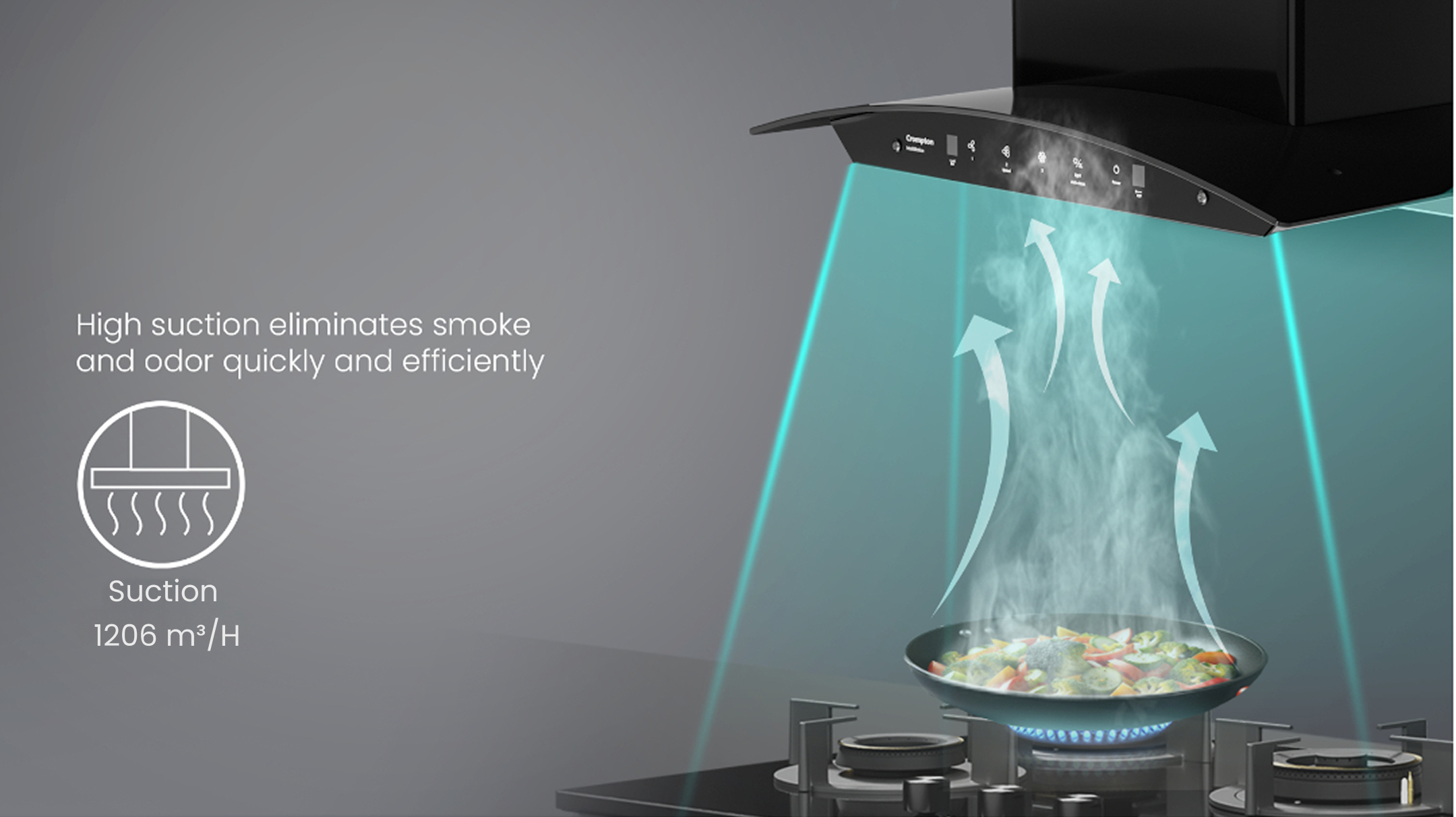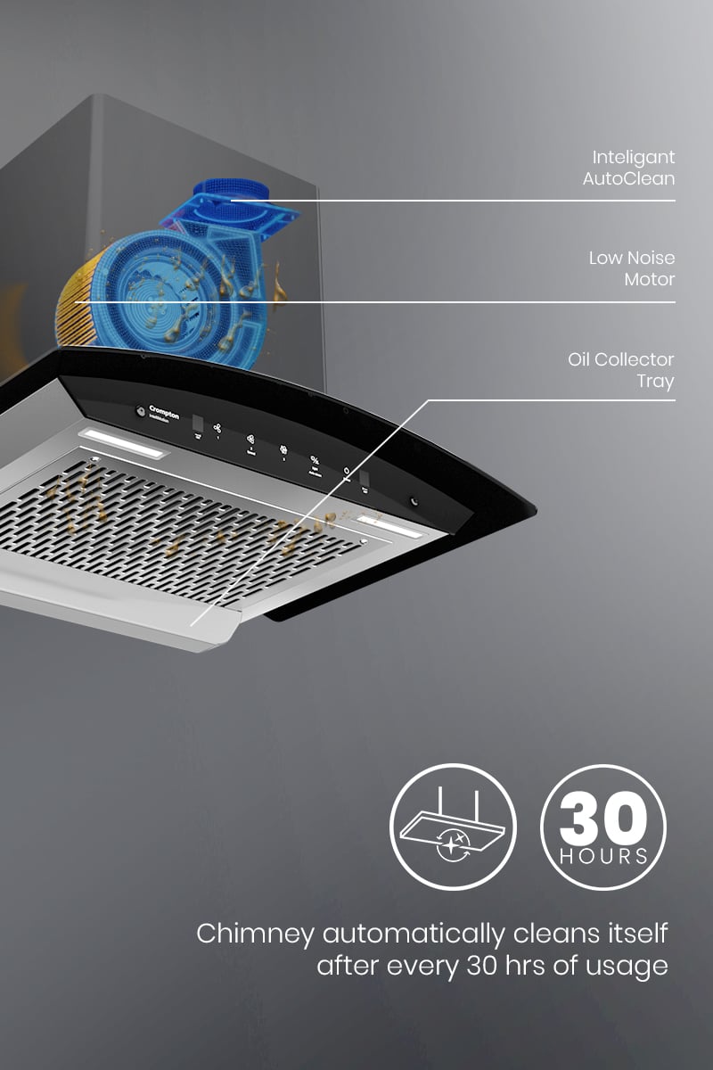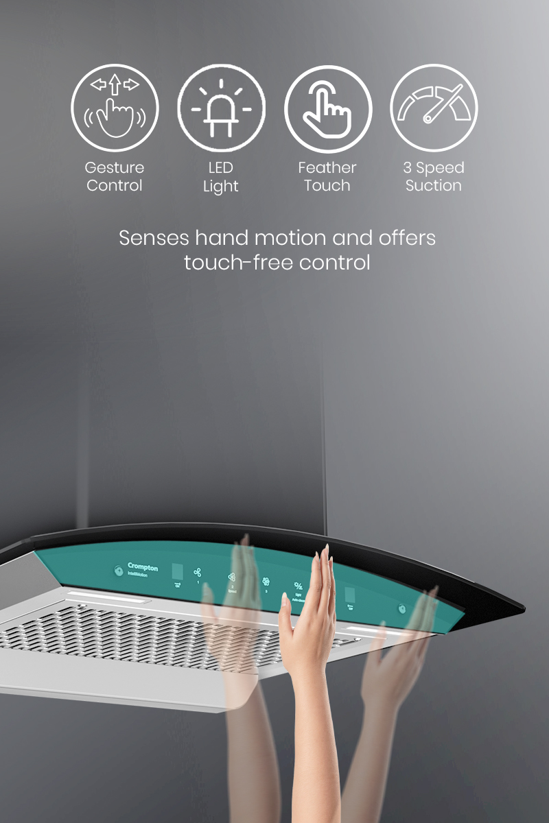 The Crompton IntelliMotion Chimney offers a perfect blend of innovation and convenience for your kitchen. Its filterless technology eliminates the need for cleaning or replacing filters, while ensuring powerful suction to keep your kitchen smoke-free.The Intelligent AutoClean feature activates after every 30 hours of usage, making maintenance a breeze. With a low-noise motor and a sleek curved design, it seamlessly fits into any kitchen decor, creating a peaceful cooking environment. Enjoy hands-free operation with IntelliMotion Gesture Control, allowing you to control the chimney with a wave of your hand. The Smart ON feature automatically turns on the chimney by detecting temperature changes when you start cooking, offering unparalleled convenience.
