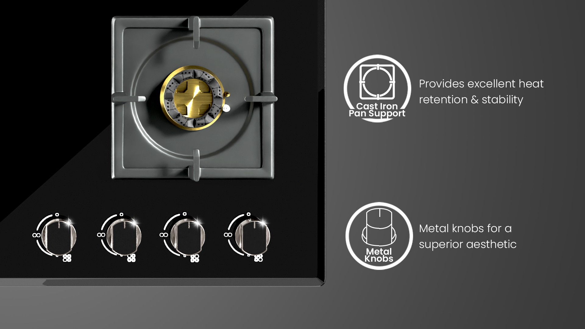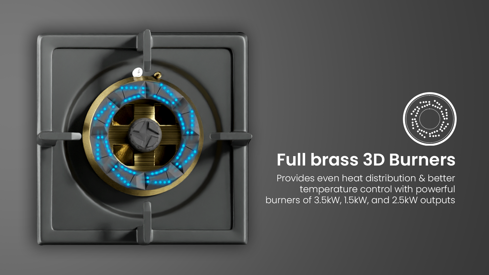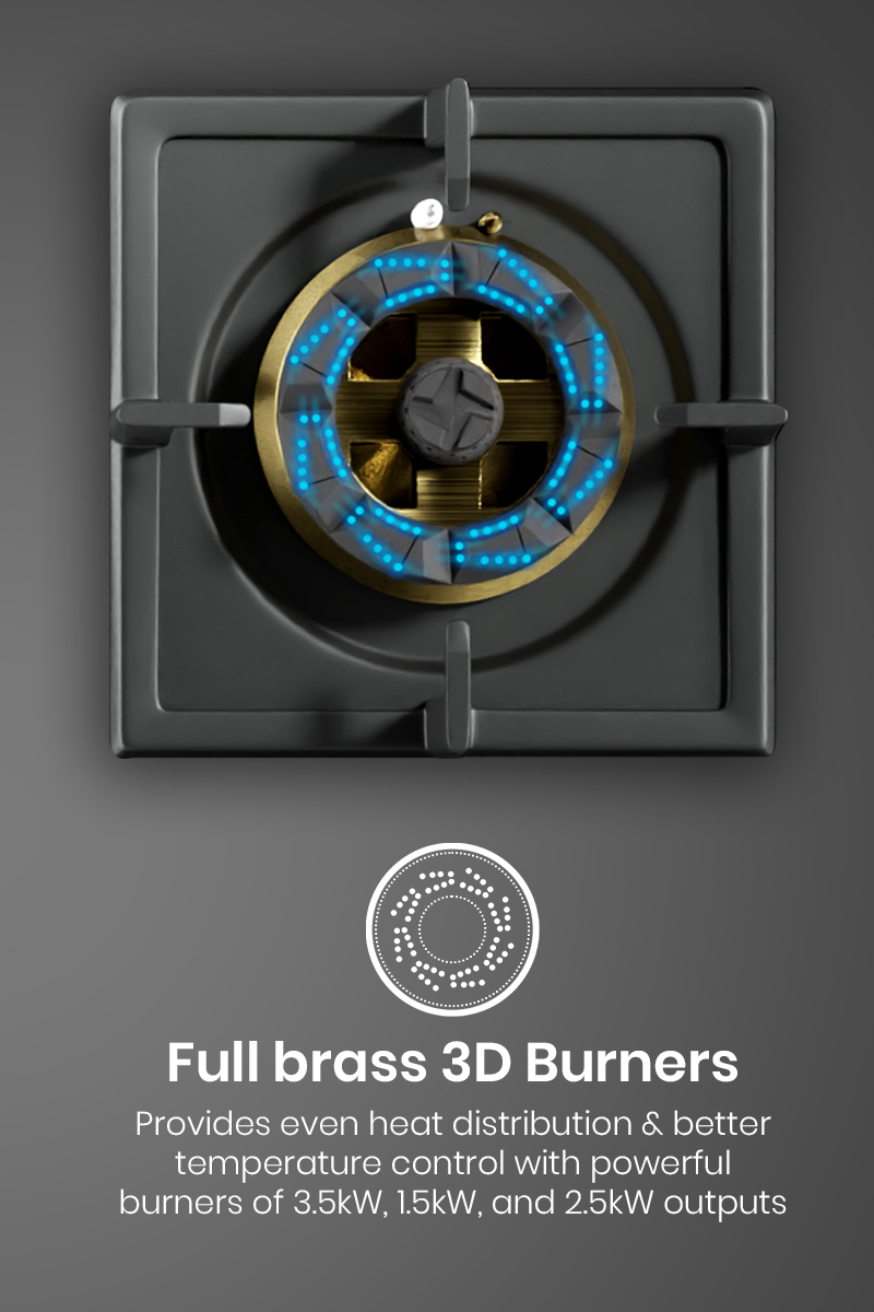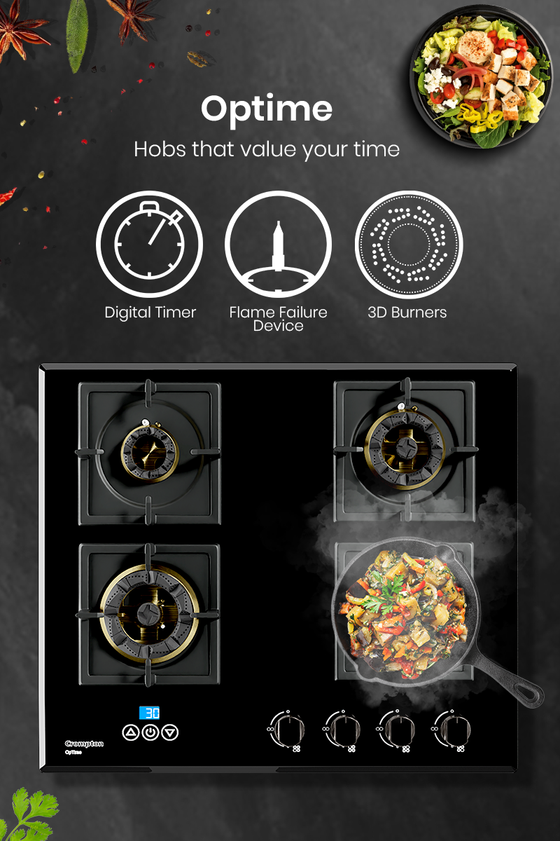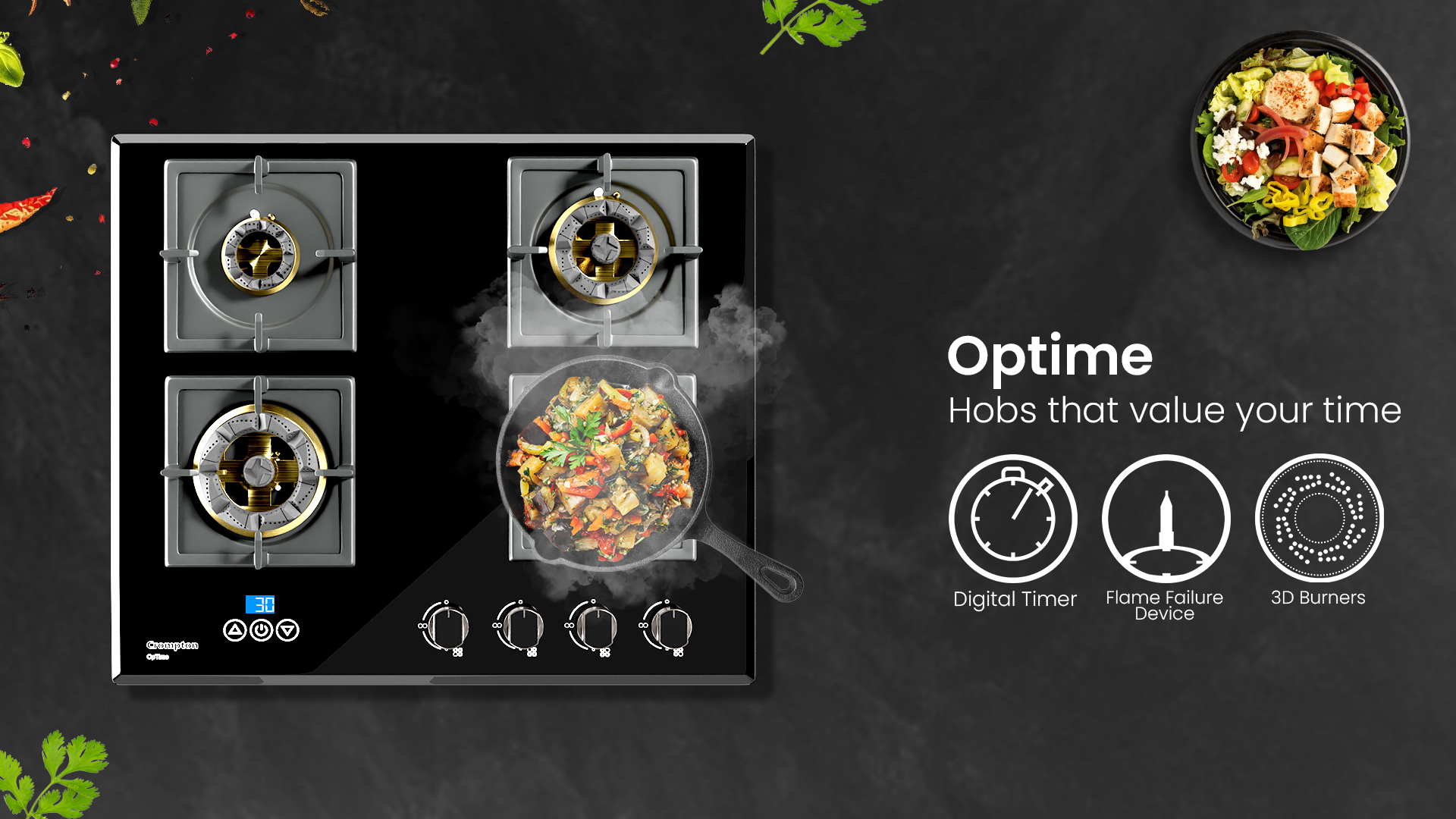 Discover the Crompton Optime Hobs, crafted to bring ease and precision to your kitchen. With a built-in Digital Timer, you can set exact cooking durations, ensuring perfect results every time. The Flame Failure Device (FFD) offers advanced safety by automatically shutting off the gas supply if the flame goes out, giving you peace of mind. Experience even heat distribution with the powerful Full Brass 3D Burners, providing superior temperature control for every dish. Whether it's a quick stir-fry or a slow-cooked recipe, the burners' efficient design ensures consistent cooking results. With Crompton Optime Hobs, every meal preparation becomes seamless and enjoyable.