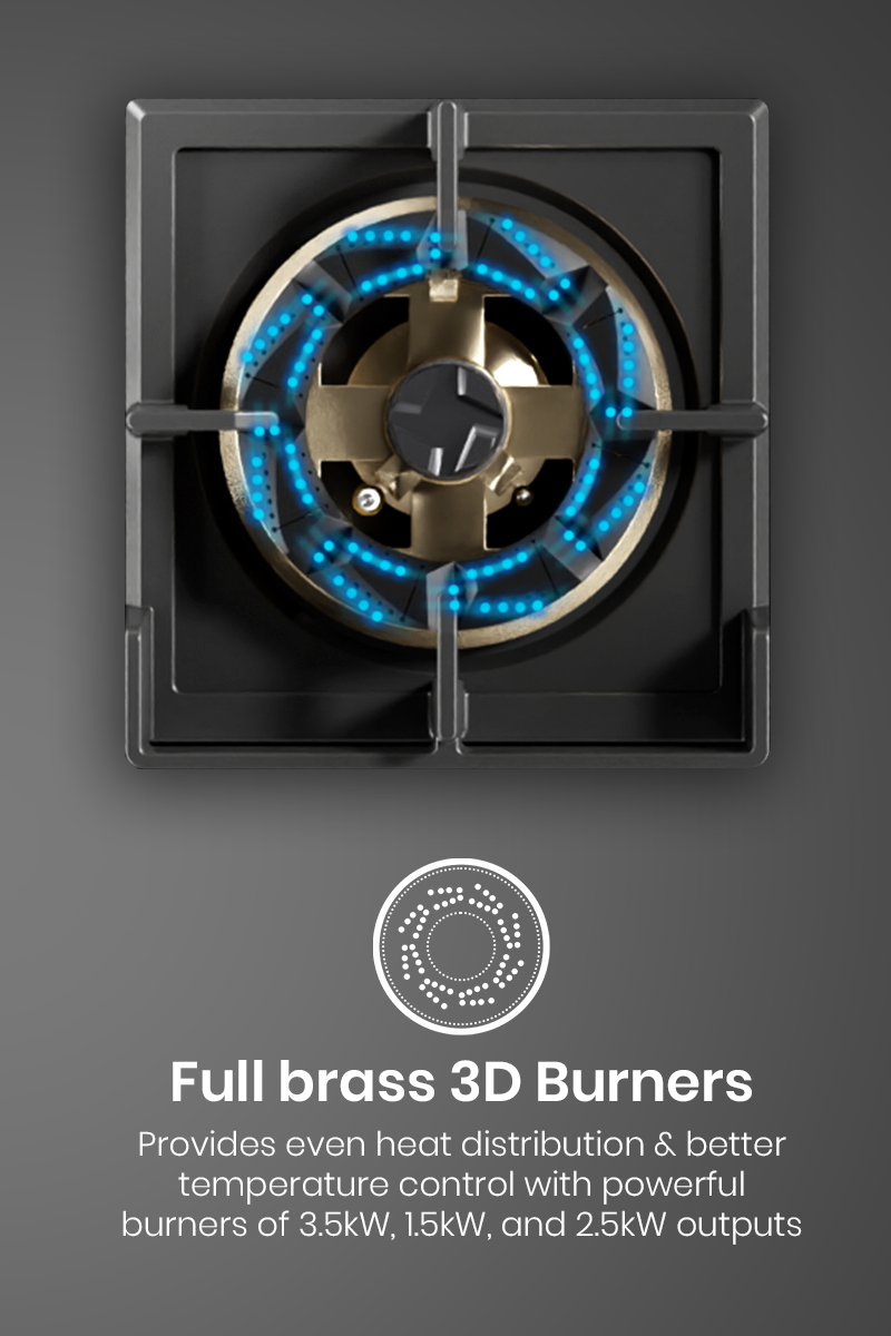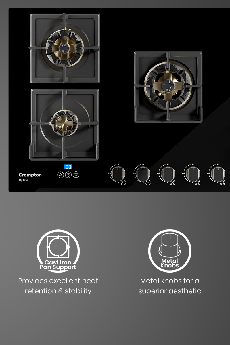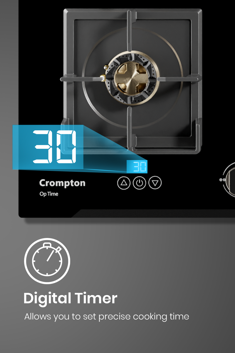 Discover the Crompton Optime Hobs, crafted to bring ease and precision to your kitchen. With a built-in Digital Timer, you can set exact cooking durations, ensuring perfect results every time. The Flame Failure Device (FFD) offers advanced safety by automatically shutting off the gas supply if the flame goes out, giving you peace of mind. Experience even heat distribution with the powerful Full Brass 3D Burners, providing superior temperature control for every dish. Whether it's a quick stir-fry or a slow-cooked recipe, the burners' efficient design ensures consistent cooking results. With Crompton Optime Hobs, every meal preparation becomes seamless and enjoyable.