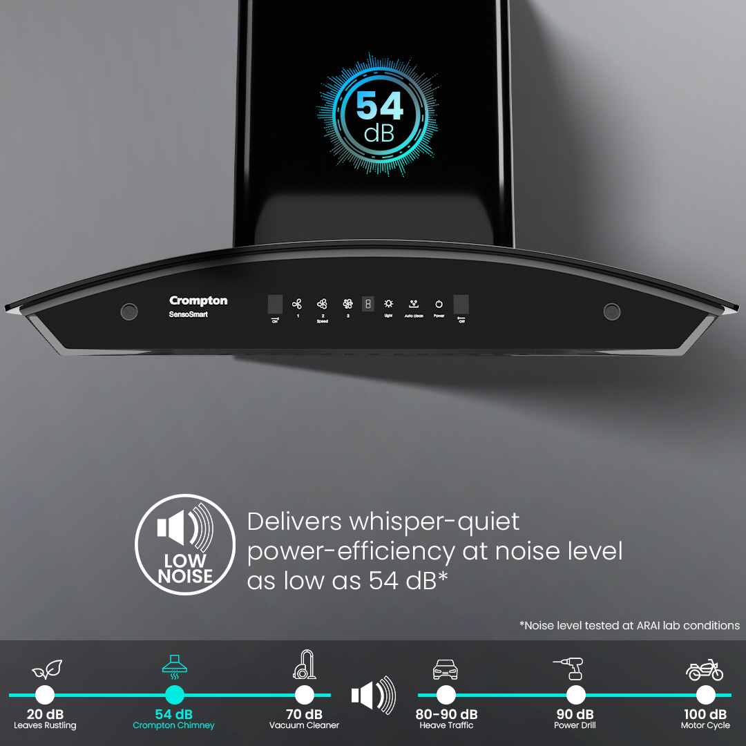 Experience effortless cooking with the Crompton SensoSmart Box chimney, designed to work seamlessly in sync with your kitchen. The unique design effortlessly blends in with your space and its advanced sensors detect when you start cooking. It switches on the chimney automatically to keep your space fresh. With a simple hand gesture, you can control its functions without even touching it. The intelligent AutoClean feature saves you time, as it clears out grime and oil after 30 hours of use, ensuring a hassle-free cleanup. Plus, the powerful suction quietly removes smoke and odors, allowing you to enjoy peaceful moments in the kitchen. With SensoSmart Box chimney, you can focus on cooking delicious meals while it handles the rest, keeping your kitchen clean and comfortable at all times.